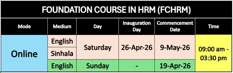 The Foundation Course in Human Resource Management (FCHRM) is an ideal entry programme for school leavers who wish to explore the field of Human Resource Management. Designed especially for students after completing O/Ls, this course introduces the fundamentals of HRM and helps you understand the basic building blocks of HR practices used in modern organizations.